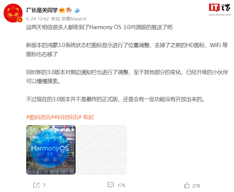 华为鸿蒙 HarmonyOS 3.0 开发者 Beta 版本已开启公测招募,今日开始审核推送。据博主 @厂长是关同学 消息,鸿蒙 HarmonyOS 3.0 的状态栏图标有变。