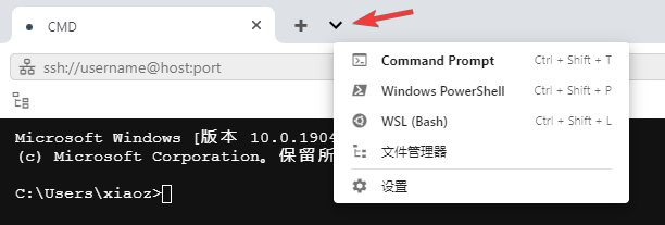 Windows系统下,默认使用cmd作为终端,也可以选择使用PowerShell或者WSL(如果你有安装的话)作为终端,只需要点“+”号旁边那个向下的箭头即可。