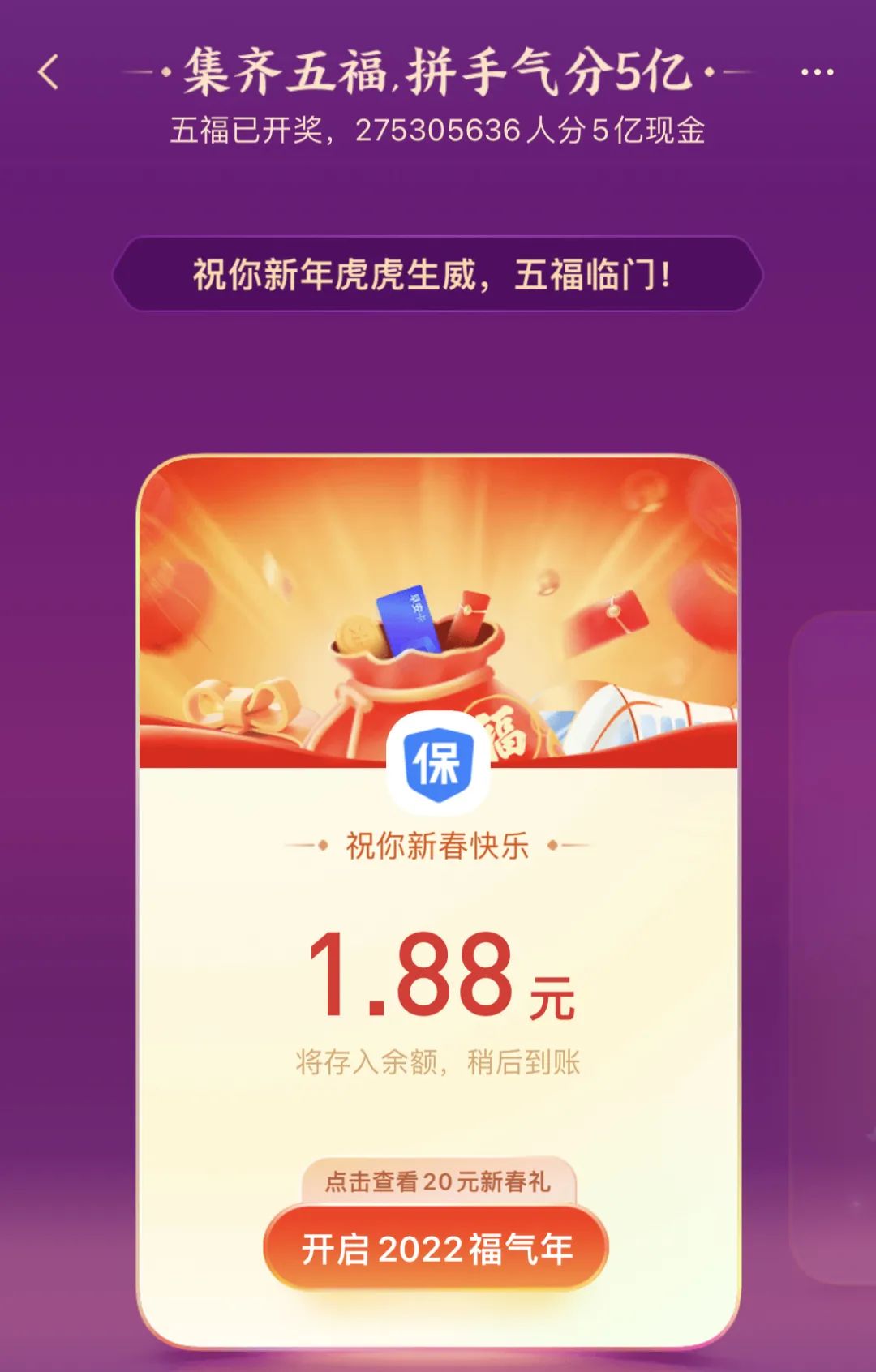 但到了 2022 年支付宝集五福活动开奖,共有 275305636 人分 5 亿现金,平均每人不到两块钱,只能说参与活动图个乐呵。