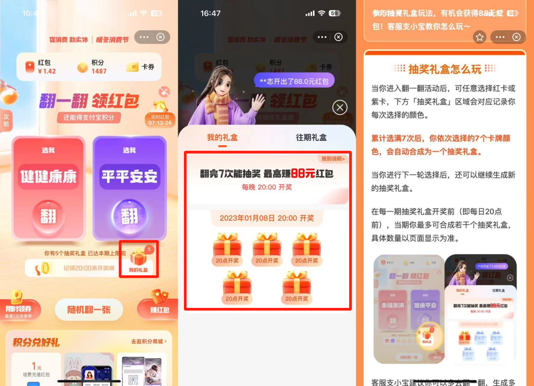 点击“我的礼盒”,根据里面提示的指定时间,来开启礼盒,即可获得奖励,运气好的可以提前开出“五福礼包”。