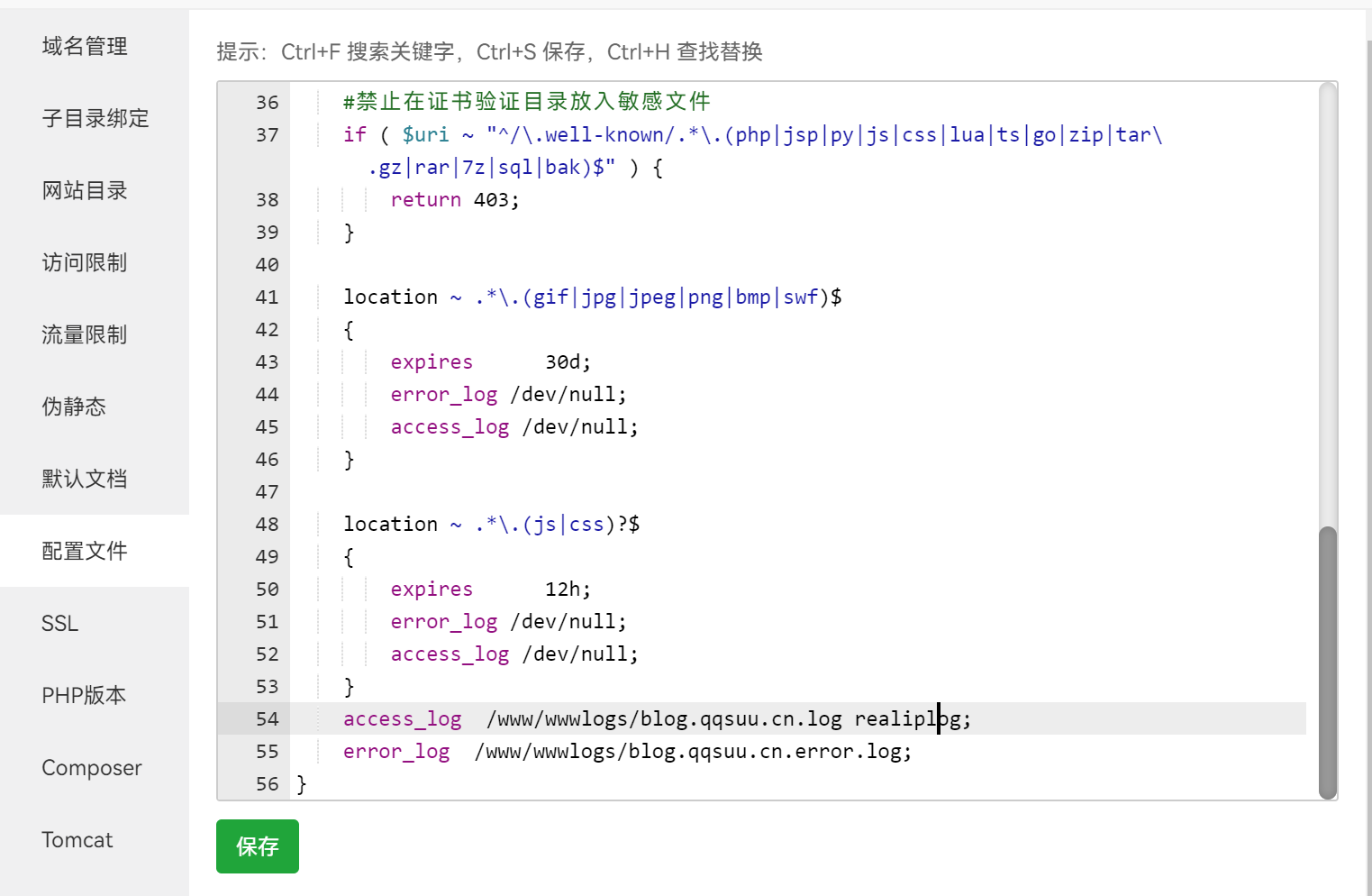 2、找到已开启CDN的网站的配置文件,将最后的