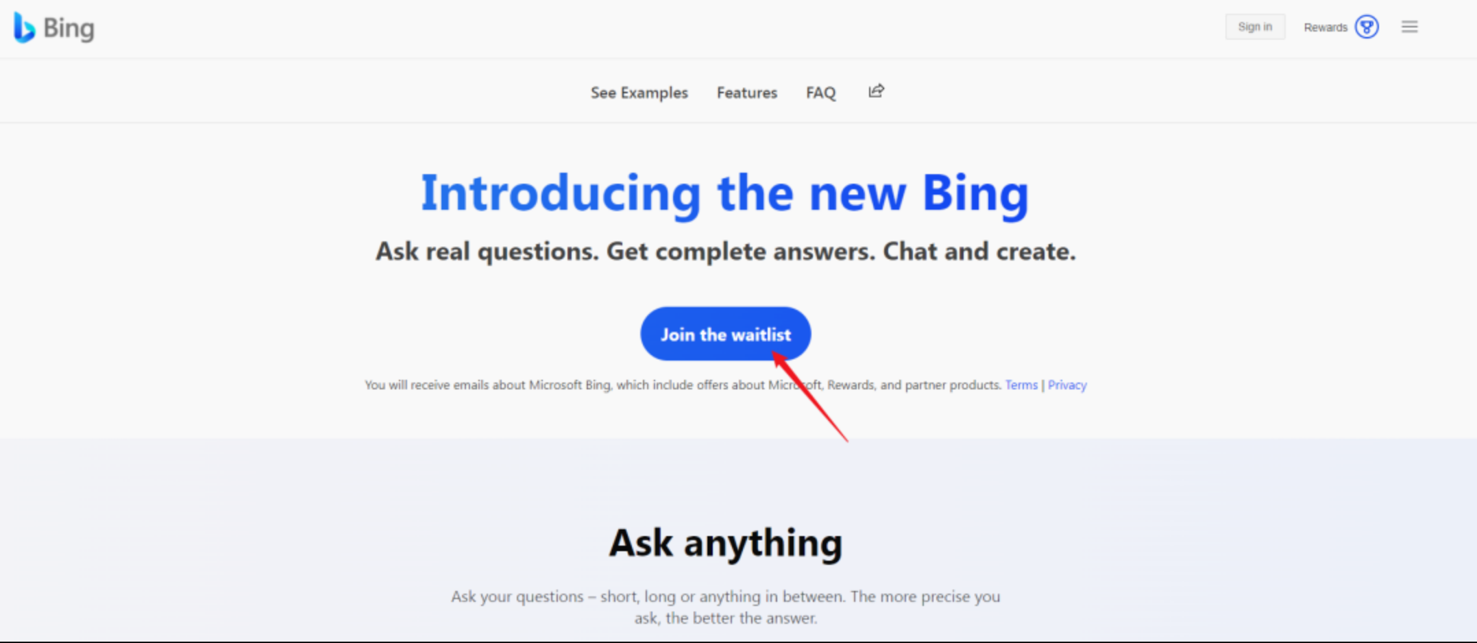 3、重启浏览器,然后再进入新的Bing网站,就可以正常打开了。点击一下申请候选“Join the waitlist”,这个时候需要登录微软账户。
