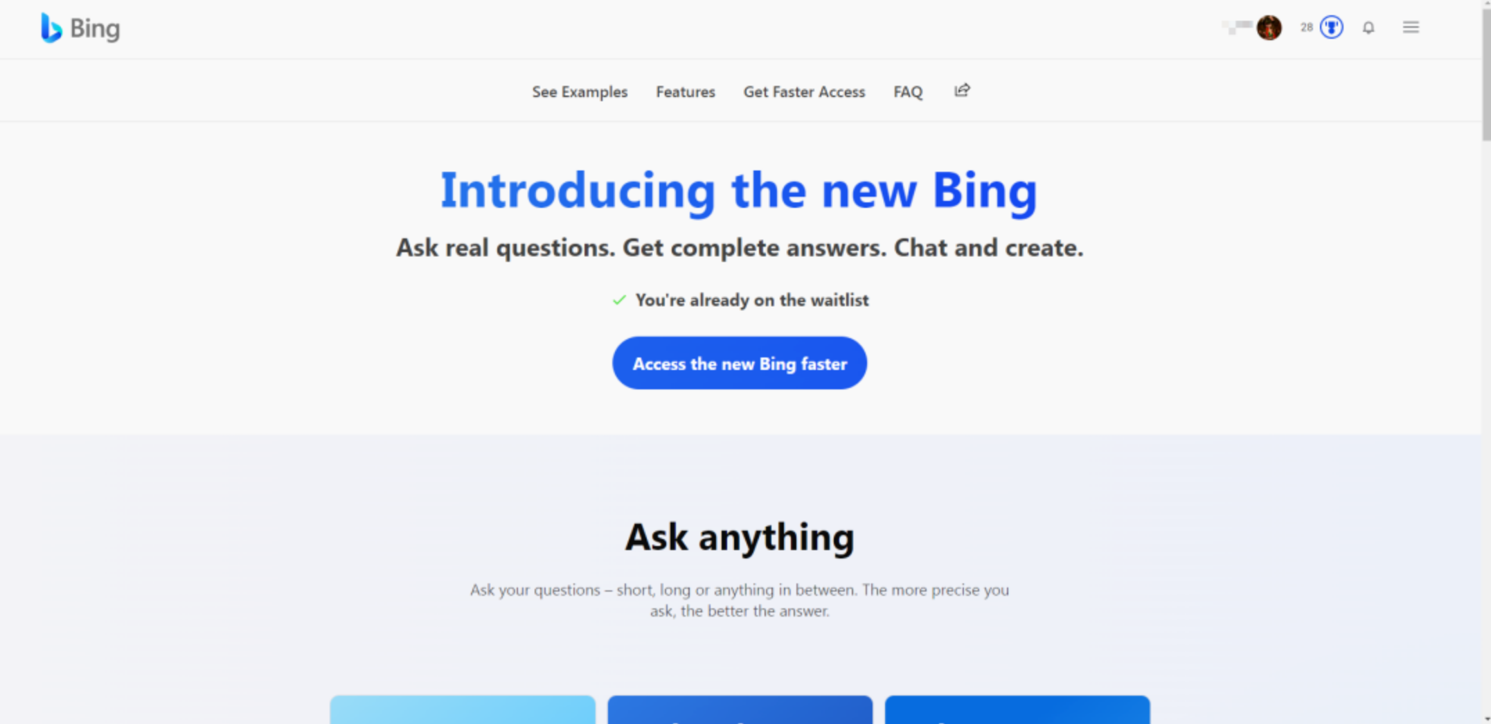 前不久的新闻,微软的Bing搜索引擎与ChatGPT合作,打开如下网站,可以获取“使用ChatGPT版Bing”的后补资格。