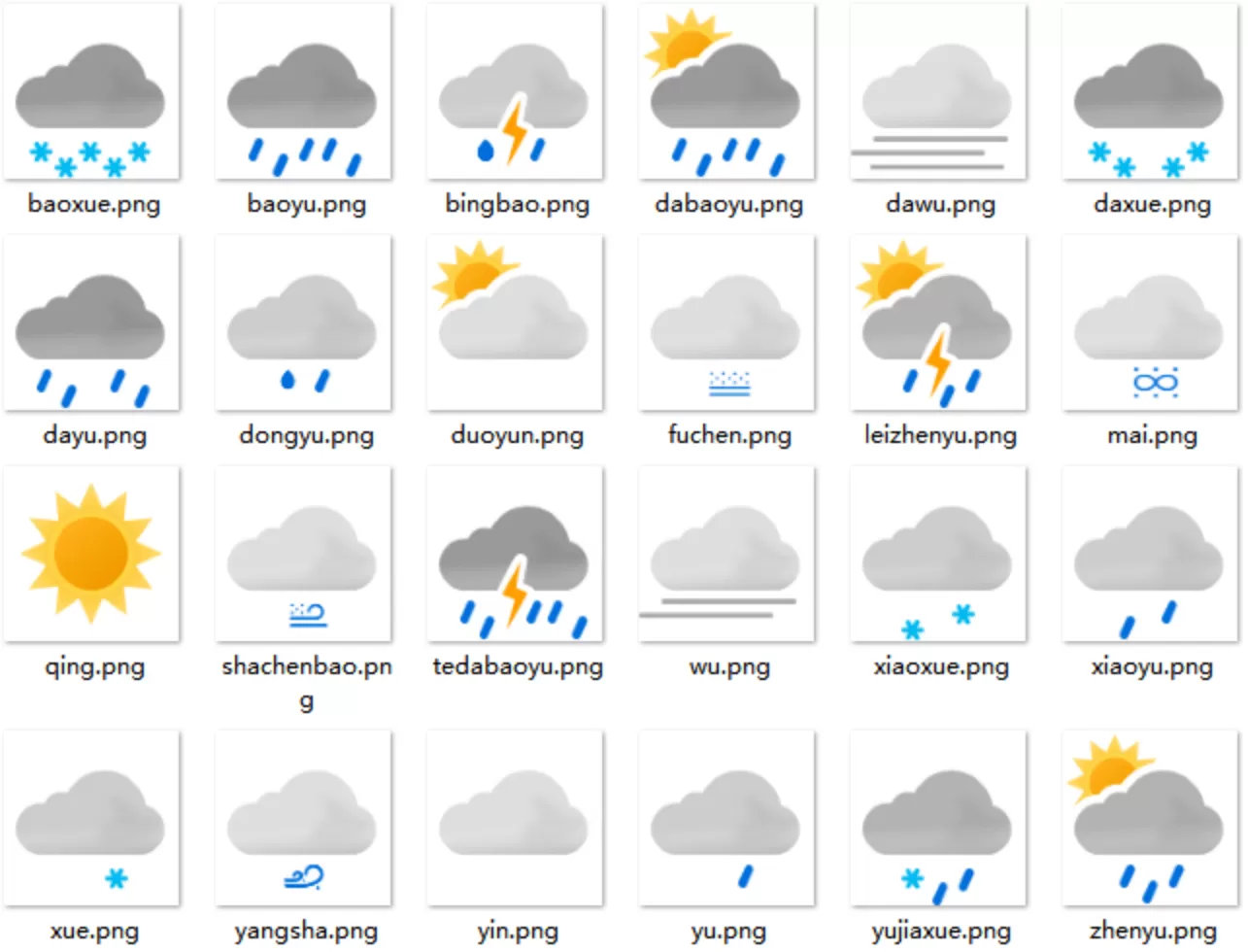天气预报API接口的天气变化图标经过二次绘制增加了新的png和svg矢量文件,现已覆盖了绝大部分天气状态场景,可在接口文档页面免费下载使用。 其中返回参数wea……